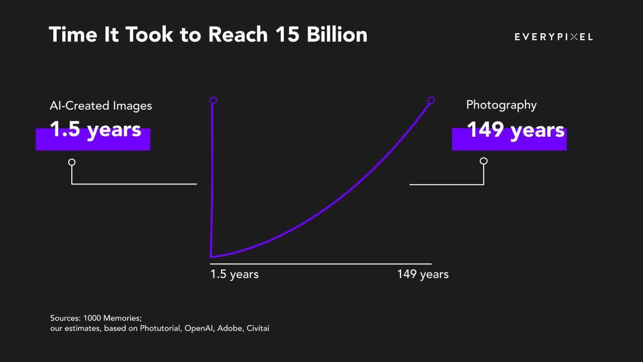 طبق این نمودار، تولید ۱۵ میلیارد تصویر توسط هوش مصنوعی تنها ۱.۵ سال زمان برده است، در حالی که رسیدن به همین تعداد تصویر از طریق عکاسی سنتی به ۱۴۹ سال زمان نیاز داشته است.